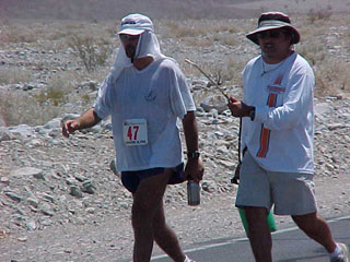 Tim Hewitt quickly went off the front as the race began Many wondered if he was trying to catch the 8am group before they reached Furnace Creek. Margaret Schlundt and Stanley Duobinis, a married couple and the only such "team" in the race, were making a comfortable pace in the middle of the field. Uli Weber and Eberhard Frixe of Germany were running stride for stride together as well. It's going to be a long day for everyone out there, regardless of when they stated the race.