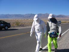 Having the Ice Man around certainly helps. New this year, race officials set-up a tab at Furnace Creek and provided a one-man traveling oasis along the course dispensing perhaps the most precious commodity in Death Valley, bags of ice for any runners and crew who needed it. Mike Angelos played the role of the Ice Man, or perhaps Santa without the red suit. Said Mike, "I coulda made a mint. I'm just giving it away. I coulda been rich." |
